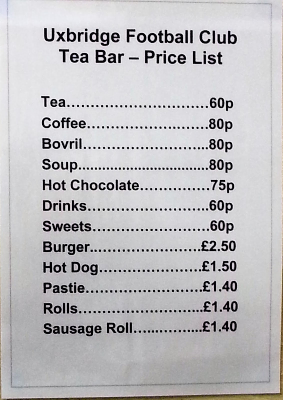 On the day of the game, it was my day off work, as per usual for a Tuesday. I'd had a pretty decent night's sleep, waking at 9 am. After getting dressed and ready, I went up the local Rebellion Brewery with my Dad and bought myself a couple of bottles of cider for Christmas. After stopping in Wycombe and getting a few other things, I came home and had lunch. The afternoon was spent doing the last of my Christmas shopping online, plus recalling my previous visits to Uxbridge FC and the club history for my blog. Handily, the programme was available online for free, so I had a look through it, noting that as on my previous visit, it was a pretty decent effort. After a dinner of lamb curry and doing some work on my Coventry City blog for Friday, I got my things together and left at 6.50. It was a good journey over, with me getting to the ground at 7.30. Near the ground, there was a big crash between a car and a lorry. Thankfully the people looked OK, but I made my way gingerly through the bits of smashed plastic, hoping not to get a puncture. This was something I double-checked at half-time, but thankfully there were none. I caught up online before going in, paying £8 for entry and finding a place on the halfway line.