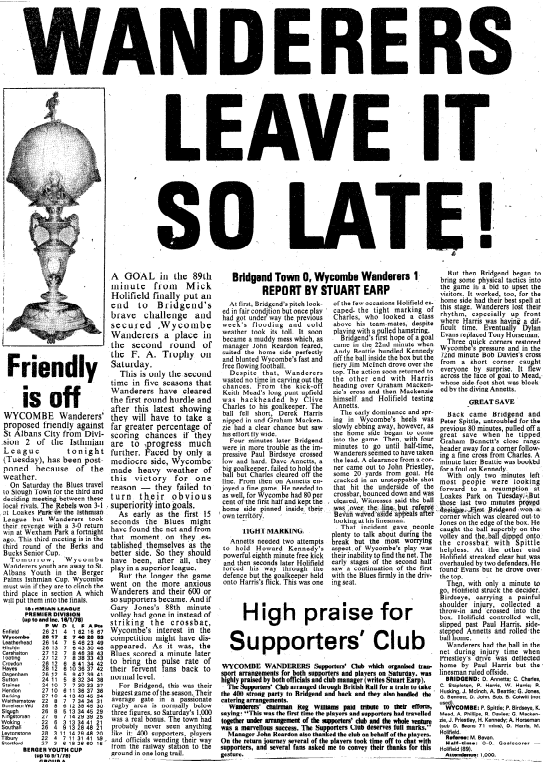 The more prominent of the two former clubs was Bridgend Town. They were formed in 1920 and spent time in the Southern League in the 1920s and between 1977 & 1983. They were Southern League champions in 1980. Back then, the league was split into two regional divisions. Bridgend won the Midland Division and then beat Dorchester Town 5-1 over two legs to win the championship playoff match. In Wales, their best league finish was as Welsh League Champions in 1969 & 1973. Cup highlights included two Welsh Cup semi-finals and the FA Cup 4th Qualifying Round in 1979 where they lost in a replay to Hungerford Town. In the FA Trophy, they played my team Wycombe Wanderers in 1977, narrowly losing 1-0. They continued to play in the FA Trophy whilst members of the Welsh League and this was when they made their best progress - reaching the 2nd Round in 1986, losing 1-0 at Worthing. They also won the Welsh League Cup in 1988.